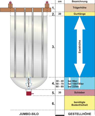 Jumbo-Silos werden je nach Befüllzustand um ca. 50-70cm länger – vollbefüllt baucht der Boden unten ca. 50cm aus, der leere Sack ist bis zu 70cm länger!